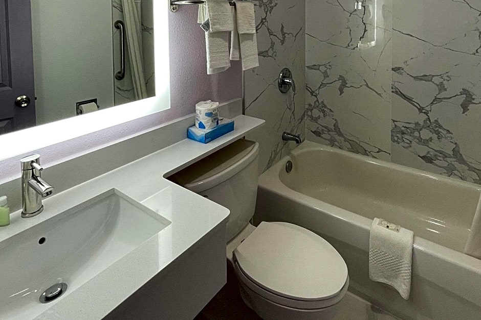 The suite provides air conditioning, a tea and coffee maker, tumble dryer, a carpeted floor and a flat-screen TV with streaming services.